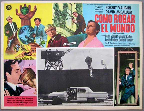 Beautiful Mexican jumbo lobby card (12.5x16.5") from the 1968 MGM action / espionage / comedy film, HOW TO STEAL THE WORLD, which starred Robert Vaughn, David McCallum, Barry Sullivan, Eleanor Parker, Leslie Nielsen and Leo G. Carrol. This film was compiled from two episodes of the Man From U.N.C.L.E. TV show, which were reedited and released theatrically in foreign countries. American produced posters and lobby cards from the film are quite scarce. $25 each