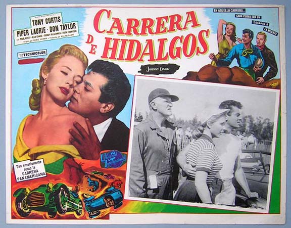 Beautiful Mexican jumbo lobby card (12.5x16.5") from the 1954 Universal auto racing film JOHNNY DARK, which starred Tony Curtis, Piper Laurie, Don Taylor, Paul Kelly, Ilka Chase and Sidney Blackmer. $20 each