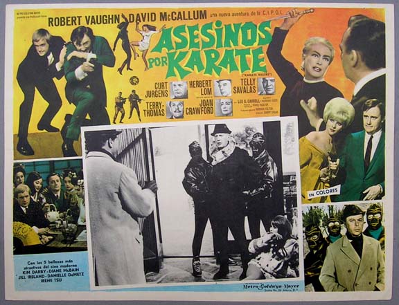 Beautiful Mexican jumbo lobby card (12.5x16.5") from the 1967 MGM action / espionage / comedy film, THE KARATE KILLERS, which starred starred Robert Vaughn, David McCallum, Leo G. Carroll, Joan Crawford, Curd Jurgens, Herbert Lom, Telly Savalas, Terry-Thomas and Diane McBain. THE KARATE KILLERS was created by combining two episodes from the popular MAN FROM U.N.C.L.E. American produced posters and lobby cards from the film are quite scarce. $20 each