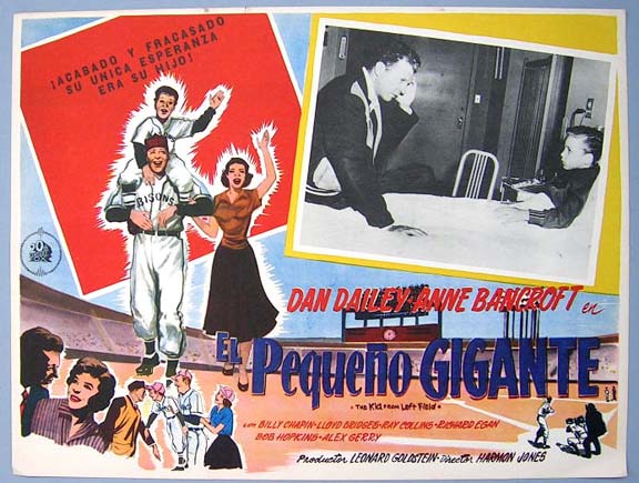 Beautiful Mexican jumbo lobby card (12.5x16.5") from the 1953 20th Century Fox baseball film, THE KID FROM LEFT FIELD, which starred Dan Dailey, Anne Bancroft, Billy Chapin, Lloyd Bridges and Ray Collins. $20 each