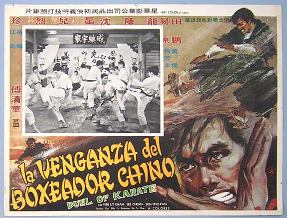 Beautiful Mexican jumbo lobby card (12.5x16.5") from an unidentified martial arts film -- probably produced in the 1970s. The Spanish title of the film is, La Venganza del Boxeador Chino. If anyone can help us identify this film, we'd appreciate hearing from you. $15 each