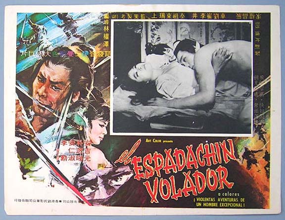 Beautiful Mexican jumbo lobby card (12.5x16.5") from an unidentified martial arts film -- probably produced in the 1970s. The Spanish title of the film is, La Espadachin Volador. If anyone can help us identify this film, we'd appreciate hearing from you. $15 each