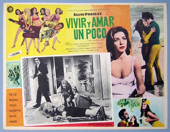 Beautiful Mexican jumbo lobby card (12.5x16.5") from the 1968 MGM Rock 'n Roll / musical film, LIVE A LITTLE, LOVE A LITTLE, which starred Elvis Presley, Michele Carey, Don Porter, Rudy Vallee, Dick Sargent, Sterling Holloway and Celeste Yarnall. $20 each