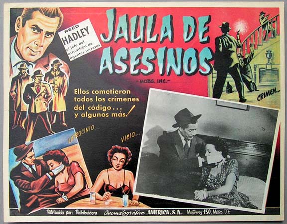 Beautiful Mexican jumbo lobby card (12x15") from the 1956 crime film, MOBS INC., which starred Reed Hadley, Lisa Howard, Marjorie Reynolds, Douglass Dumbrille and Linda Leighton. MOBS INC. was compiled from several episodes of the RACKET SQUAD television show, which were reedited and released theatrically in foreign countries. American produced posters and lobby cards from the film quite rare. $15 each