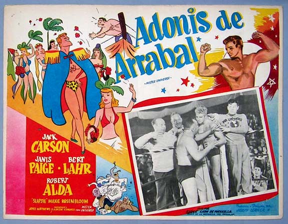 Beautiful Mexican jumbo lobby card (12.5x16.5") from the 1951 Eagle Lion wrestling / comedy film, MISTER UNIVERSE, which starred Jack Carson, Janis Paige, Vince Edwards, Bert Lahr, Robert Alda and Max 'Slapsie Maxie' Rosenbloom. $20 each