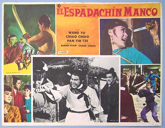 Beautiful Mexican jumbo lobby card (12.5x16.5") from the 1967 Hong Kong / Shaw Brothers martial arts film, THE ONE-ARMED SWORDSMAN, which starred Jimmy Yu Wang, Chiao Chiao, Chung-Hsin Huang and Yin Tze Pan. $25 each