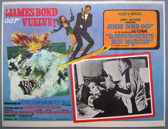 Beautiful Mexican jumbo lobby card (12.5x16.5") from the 1969 United Artists James Bond / espionage film, ON HER MAJESTY'S SECRET SERVICE, which starred George Lazenby, Diana Rigg, Tele Savalas, Gabriele Ferzetti, Bernard Lee and Lois Maxwell. $20 each