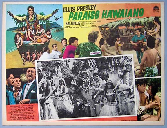 Beautiful Mexican jumbo lobby card (12.5x16.5") from the 1966 Paramount musical comedy film, PARADISE HAWAIIAN STYLE, which starred Elvis Presley, Suzanna Leigh, James Shigeta, Donna Butterworth, Marianna Hill and Irene Tsu. $25 each