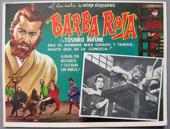 Beautiful Mexican jumbo lobby card (12.5x16.5") from the 1965 Japanese samurai film, RED BEARD, which starred Toshiro Mifune, Yuzo Kayama, Tsutomu Yamazaki and Reiko Dan. The film was directed by Akira Kurosawa. $20 each