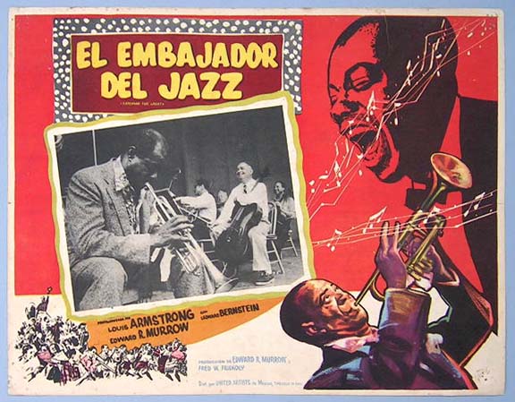 Beautiful Mexican jumbo lobby card (12.5x16.5") from the 1957 United Artists musical documentary film, SATCHMO THE GREAT, which featured appearances by Louis Armstrong, Leonard Bernstein, Barrett Deems, W.C. Handy and Edward R. Murrow. $20 each