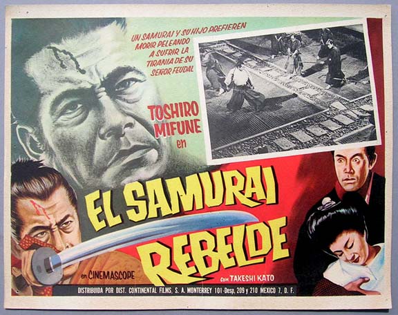 Beautiful Mexican jumbo lobby card (12.5x16.5") from the 1967 Japanese samurai / martial arts film, SAMURAI REBELLION, which starred Toshiro Mifune, Yoko Tsukasa, Takeshi Kato and Tatsuyoshi Ehara. $20 each