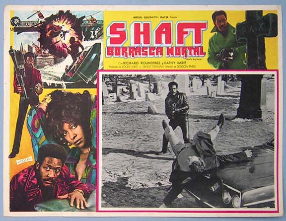 Beautiful Mexican jumbo lobby card (12.5x16.5") from the 1972 MGM mystery / Blaxploitation film, SHAFT'S BIG SCORE, which starred Richard Roundtree, Moses Gunn, Drew Bundini Brown, Joseph Mascolo and Kathy Imrie. $20 each