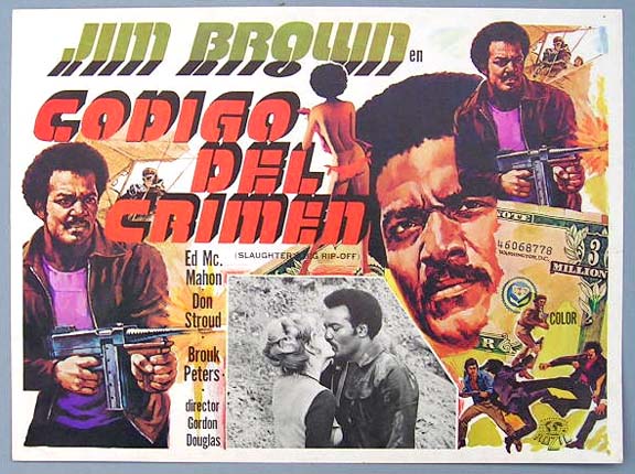 Beautiful Mexican jumbo lobby card (12x16") from the 1973 AIP Blaxploitation film, SLAUGHTER'S BIG RIP-OFF, which starred Jim Brown, Ed McMahon, Don Stroud, Brock Peters and Gloria Hendry. $15 each