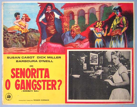 Beautiful Mexican jumbo lobby card (12x15.5") from the 1957 AIP bad girl / exploitation film, SORORITY GIRL, which starred Susan Cabot, Dick Miller, Barboura Morris, June Kenney, Barbara Crane, Fay Baker, Jeane Wood, Joan Lora, Jay Sayer, Beach Dickerson, Shirley Cleveland, Donna Leary and Laurine Hastings. The film was directed by Roger Corman. $25 each