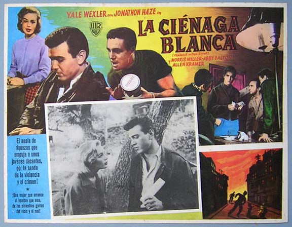 Beautiful Mexican jumbo lobby card (12.5x16.5") from the 1958 Warner Brothers crime / drug / JD film, STAKEOUT ON DOPE STREET, which starred Yale Wexler, Jonathan Haze, Steven Marlo, Abby Dalton, Allen Kramer, Herman Rudin, Philip Mansour, Frank Harding, William Shaw and Andrew J. Fenady. The film was directed by Irvin Kershner. $20 each