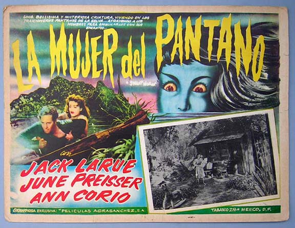 Beautiful Mexican jumbo lobby card (12.5x16.5") from the 1941 PRC exploitation film, SWAMP WATER, which starred Ann Corio, Jack La Rue, Mary Hull, Ian MacDonald and Jay Novello. $45