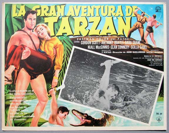 Beautiful Mexican jumbo lobby card (12.5x16.5") from the 1959 Paramount jungle adventure film, TARZAN'S GREATEST ADVENTURE, which starred Gordon Scott, Anthony Quayle, Sara Shane, Niall MacGinnis, Sean Connery and Scilla Gabel. $25 each