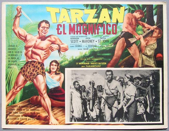 Beautiful Mexican jumbo lobby card (12.5x16.5") from the 1960 Paramount jungle adventure film, TARZAN THE MAGNIFICENT, which starred Gordon Scott, Jock Mahoney, Betta St. John, John Carradine and Lionel Jeffries. $25 each