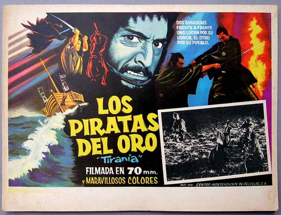 Beautiful Mexican jumbo lobby card (12.5x16.5") from an unidentified Japanese samurai film. The Spanish title of the film is, Los Piratas del Oro - Tirania. If anyone can help us identify this film, we'd appreciate hearing from you. $15 each
