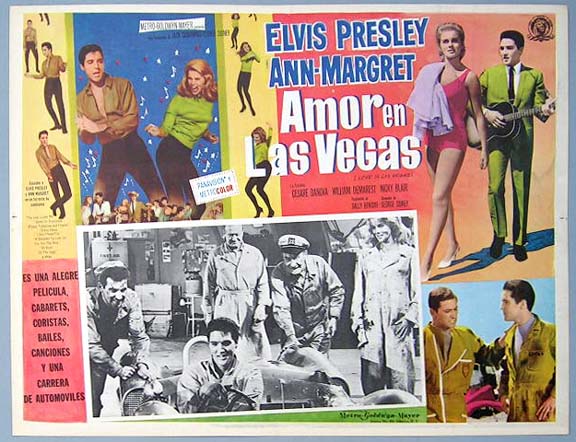 Beautiful Mexican jumbo lobby card (12.5x16.5") from the 1964 MGM musical / romance film, VIVA LAS VEGAS, which starred Elvis Presley, Ann-Margret, Cesare Danova, William Demarest, Nicky Blair and Teri Garr. $25 each