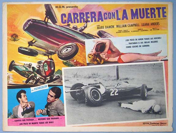 Beautiful Mexican jumbo lobby card (12.5x16.5") from the 1963 AIP auto racing film, THE YOUNG RACERS, which starred Mark Damon, William Campbell, Luana Anders, Patrick Magee, John McLaren, R. Wright Campbell, Milo Quesada, Anthony Marsh, Marie Versini, Margarete Robsahm, Christina Gregg and Beatrice Altariba. The film was directed by Roger Corman. $20 each
