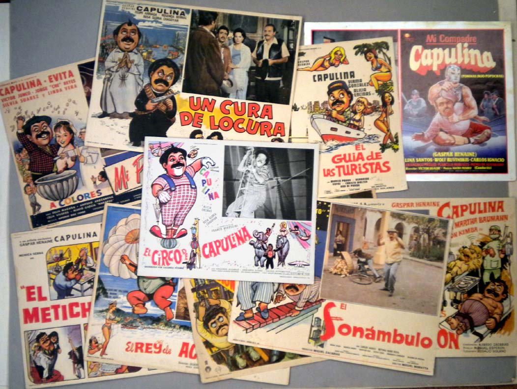 Fun Capulina comedy film lobby card (11x14") pictures the comedian in duel roles, as a monk and as a revolutionary. Colorful caricatures of the corpulent comic. Lobby cards come in sets of 8 different cards. The color artwork is the same on all cards from this film, but the small black and white is different on each card. The card currently available may have a different B&W scene than the one pictured... This film starred Gaspar 'Capulina' Henaine, Felipe Arriaga, Rosenda Bernal and Rosa Gloria Chagoyan. $10 each