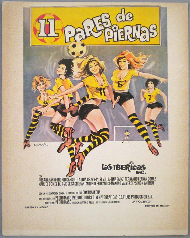Colorful Mexican horror film window card (12.5x16") features graphics that mixes sexy women with the world's most popular sport -- futbol, or as we call it in the USA, soccer. The film was also released as, Las Ibericas F.C. Great poster for a sports bar!... The film starred Rosanna Yanni, Ingrid Garbo, Claudia Gravy, Puri Villa and Tina Sainz. $30