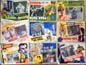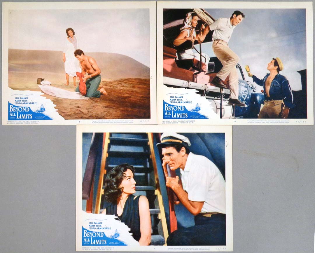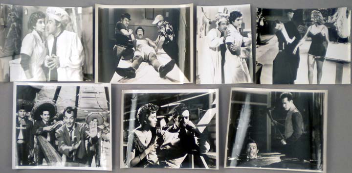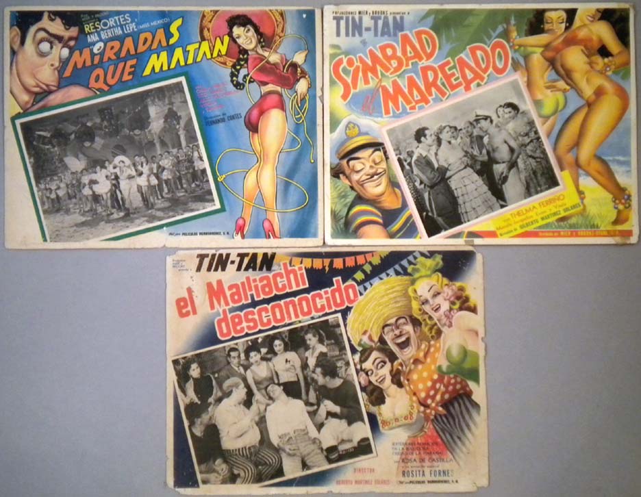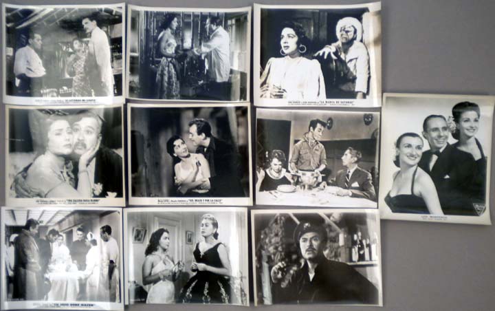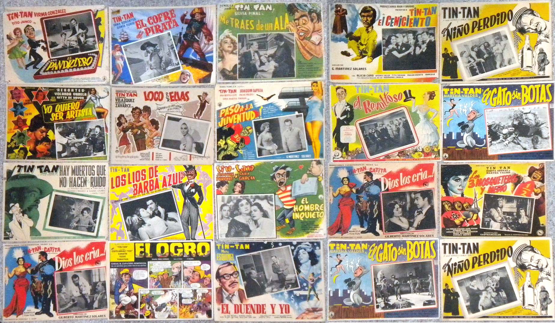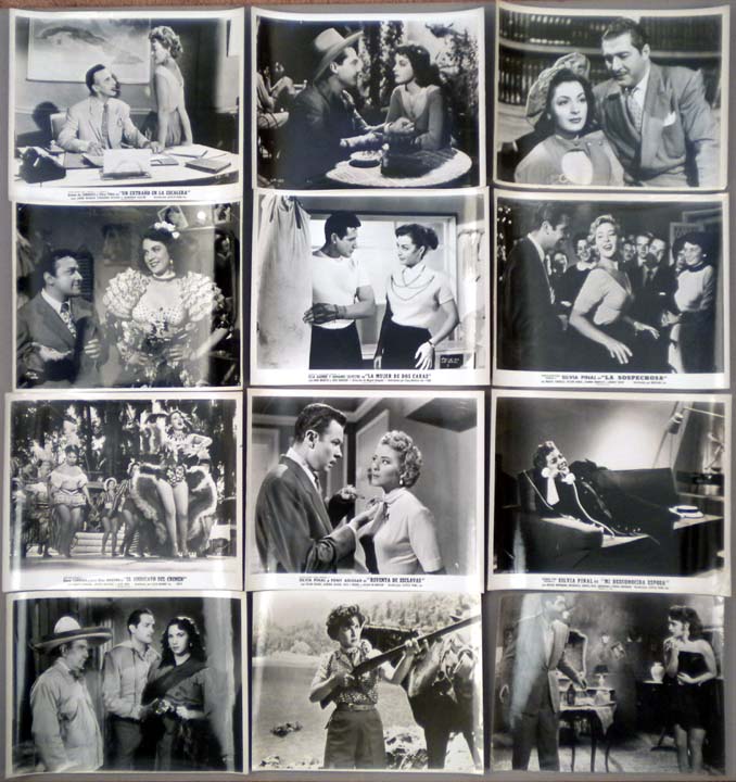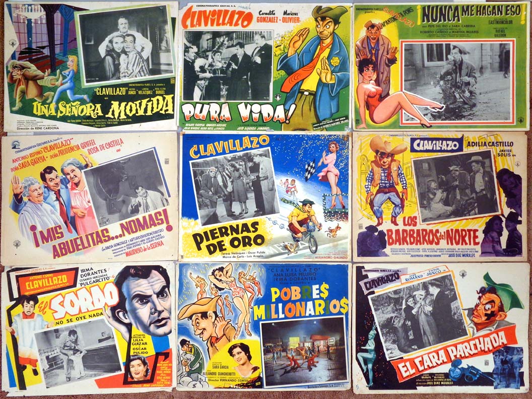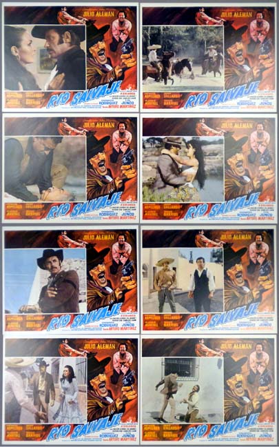 Attractive set of 8 Mexican film lobby cards (each card 11x14") which feature colorful artwork and great inset scenes picturing the main stars. You get all 8 cards for one low price! (Any glare visible in the photo was caused by a problem with our camera -- it is not a flaw on the cards themselves)... This movie starred Julio Aleman, Patricia Aspillaga, Claudia Martell, Juan Gallardo and Tito Junco. $20 (for 8 cards)