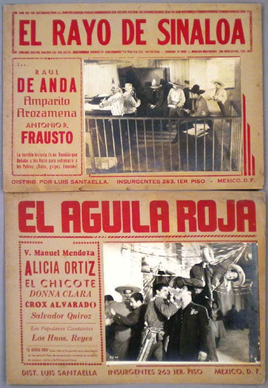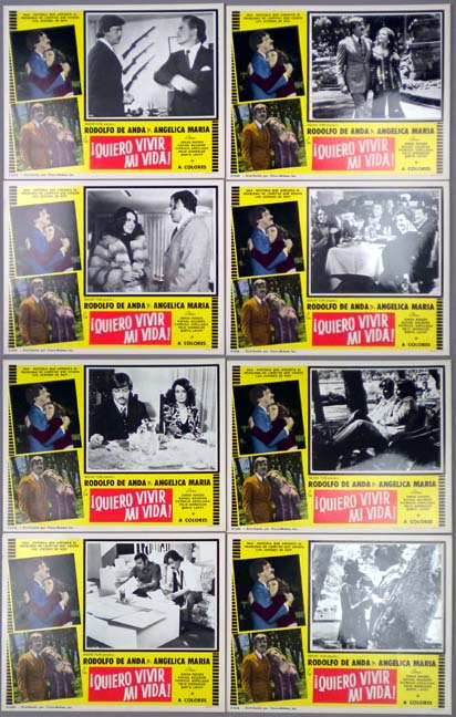 Original set of 8 Mexican film lobby cards which feature colorful artwork and great glossy inset scenes picturing the main stars. You get all 8 cards for one low price! (Any glare visible in the photo was caused by a problem with our camera -- it is not a flaw on the cards themselves)... This movie starred Rodolfo de Anda, Angelica Maria, Jorge Russek and Rafael Baledon. $20 (for 8 cards)