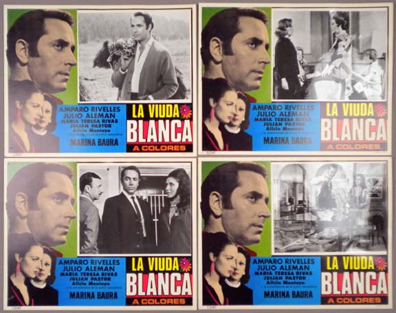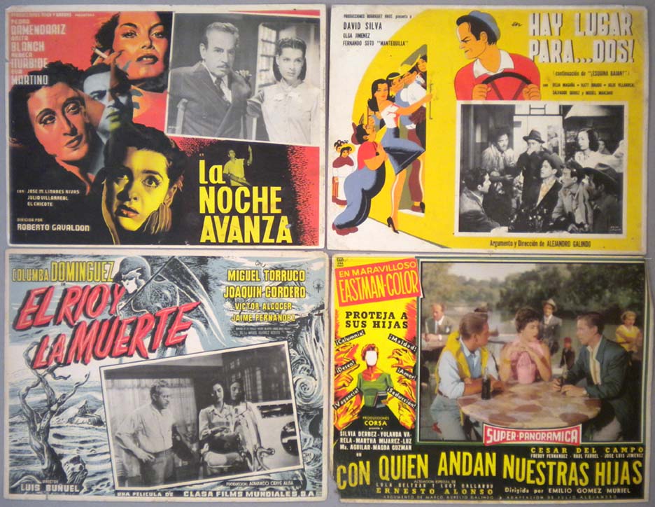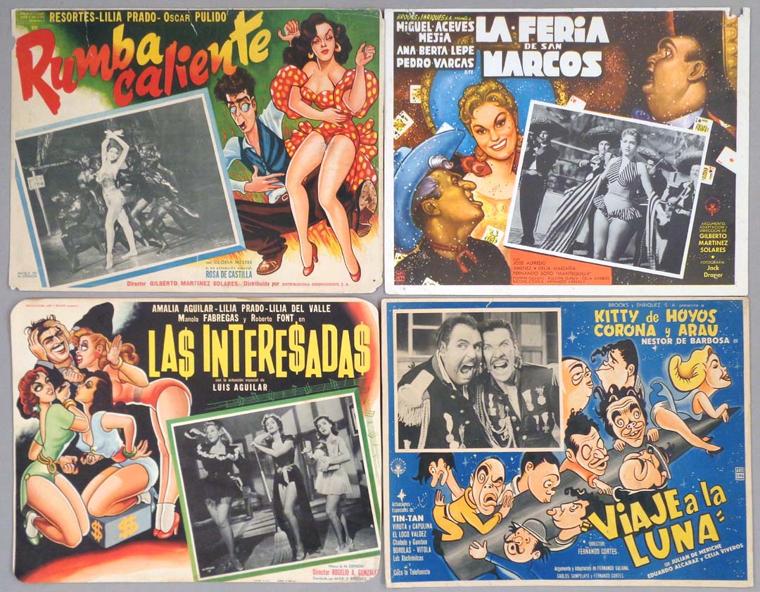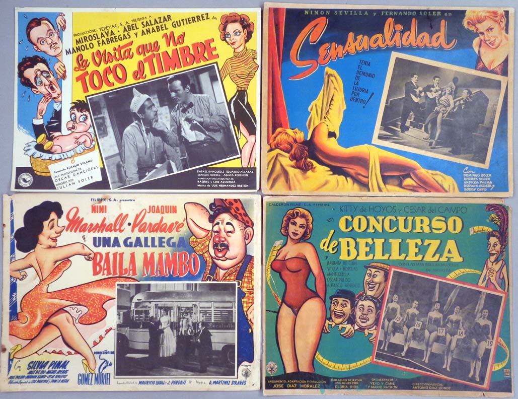 Colorful set of 4 Mexican film lobby cards which feature colorful artwork and great glossy inset scenes picturing the main stars. You get all 4 cards for one low price! (Any glare visible in the photo was caused by a problem with our camera -- it is not a flaw on the cards themselves)... This movie starred Amparo Rivelles, Julio Aleman, Julian Pastor, Marina Baura and Maria Teresa Rivas. $20 (for 4 cards)