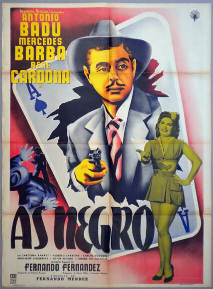Beautiful noir / crime / gambling film poster pictures a gunman, who is breaking through the ace of spades. Super! There's some wear and separation along the bottom fold line, but otherwise, it is clean and bright... This film starred Antonio Badu, Mercedes Barba, Rene Cardona, Carolina Barret and Alberto Carriere. $30