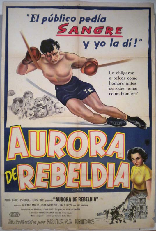 Colorful movie poster about a young Mexican-American boxer. Great graphics of boxing action inside the ring. Super! There's some edge wear along the bottom and mild spotting, but otherwise, it is in nice shape. The film was released in the USA as, The Ring... This film starred Gerald Mohr, Rita Moreno, Lalo Rios and Lillian Molieri. $40