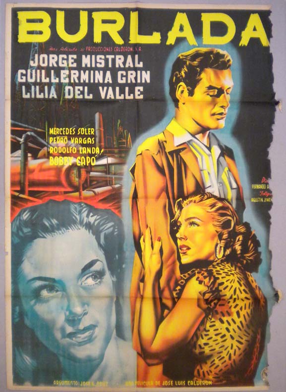 Attractive film noirish movie poster features a nice main image of the two stars together. The poster got damp along one edge at some point and this has resulted in heavy water damage along the right side -- entering into the printed portion. However, the rest of the poster is actually in great shape, and if matted and framed, it will display very well... This movie starred Jorge Mistral, Guillermina Grin, Lilia del Valle and Mercedes Soler. $20
