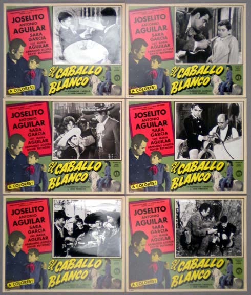 Nice set of 6 Mexican film lobby cards which feature colorful artwork and great glossy inset scenes picturing the main stars. You get all 6 cards for one low price! (Any glare visible in the photo was caused by a problem with our camera -- it is not a flaw on the cards themselves)... This film starred Joselito, Antonio Aguilar, Sara Garcia, Luz Maria Aguilar and David Reynoso. $20 (for 6 cards)
