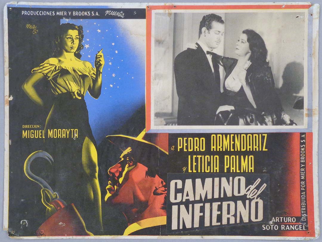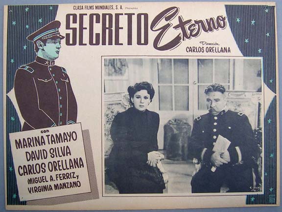 Elegant early Mexican film lobby card (9.5x13") -- from the golden age of Mexican cinema -- features stylish graphics and a nice image of the stars. There is a small chip missing from the upper right corner, but otherwise, the card is in great shape... This movie starred Marina Tamayo, Carlos Orellana, David Silva and Matilde Palou. $10 each