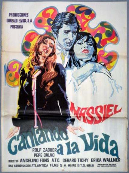 Beautiful Mexican musical poster from a Spanish film has a great image of the popular singer, Massiel. Great psychedelic 1960s style. The poster has a repaired chip on the left border and some edge wear, but the flaws are not too distracting, and they do not greatly detract from the main image area. The poster will display very well... This film starred Massiel, Rolf Zacher, Jose Calvo and Erika Wallner. (This poster has limited fold lines and will be sent rolled.) $20