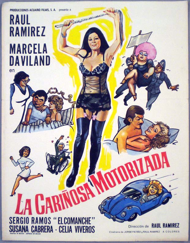 Colorful Mexican comedy film window card (12.5x16.5") combines two popular interests for men -- cars and sexy women. The automobile aspect is represented by a Volkswagen Beetle, while the other is represented by a whip-weilding dominatrix. There is a single horizontal fold the the center... The film starred Raul Ramirez, Marcela Daviland, Sergio Ramos and Susana Cabrera. $20