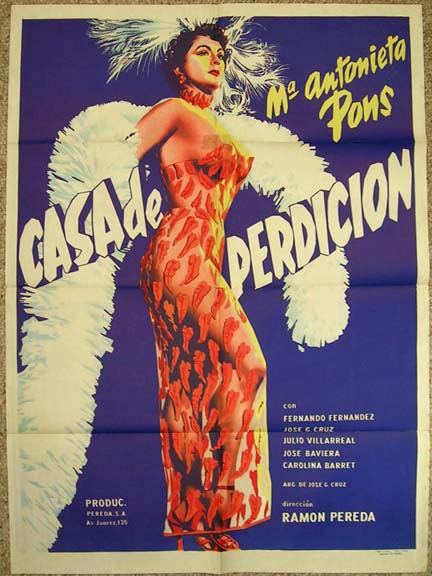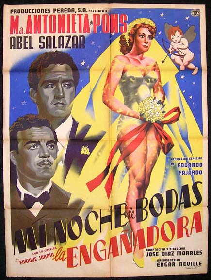 This beautiful poster has an incredible image of Ms. Pons, wearing an amazing -- and very sexy -- see-thru gown. One of the classic Mexican posters of the 1950s. In the past, there had been two pieces of tape on the back -- one each at the center of the top and bottom vertical folds -- reinforcing these sections. The tape is no longer present, but the poster has become discolored at these areas. It is not noticeable on the bottom fold, but it is a bit visible on the top fold. This flaw is is not too distracting, and otherwise, the poster is bright and will still display beautifully... This film starred Maria Antonieta Pons, Fernando Fernandez, Julio Villarreal and Jose G. Cruz. $60