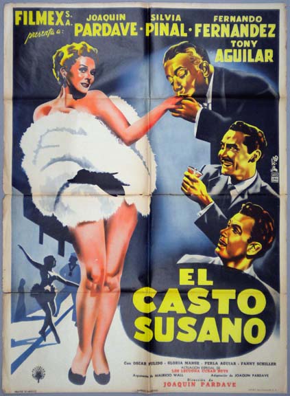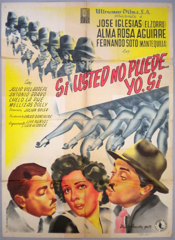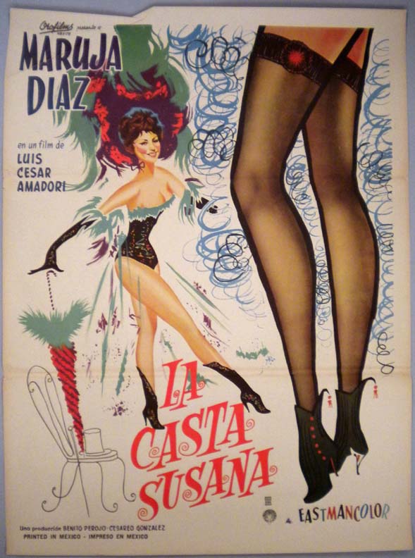 Gorgeous comedy film poster has a delicate style and lovely graphics. There are colorful portraits of three of the stars, but check out those showgirl legs!!! This is a used poster that has some signs of handling-- extra fold lines, edge wear, small tears, pinholes and surface dings -- but the flaws are not very distracting and it will display quite well... This movie starred Pepe Iglesias 'El Zorro,' Alma Rosa Aguirre, Fernando 'Mantequilla' Soto and Julio Villarreal. $40