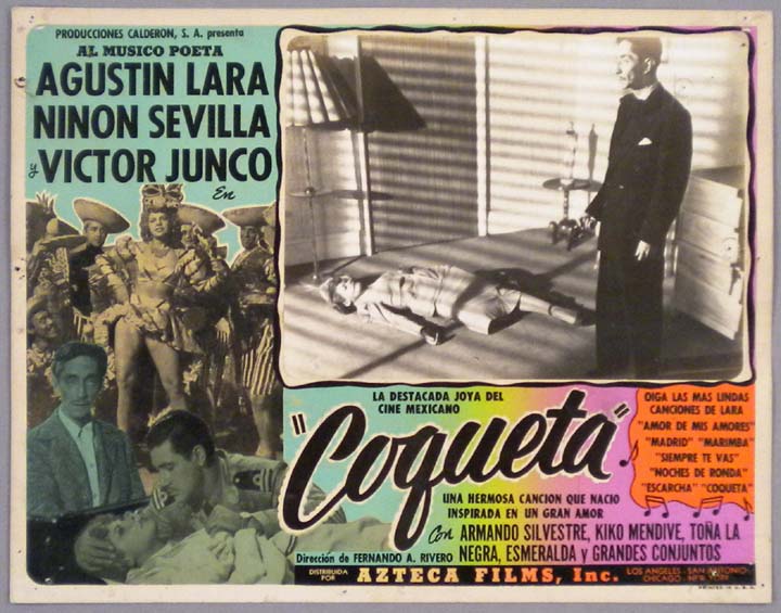 Elegant Mexican movie lobby card for a film noir classic. Ms. Sevilla is pictured on both the border art and the photo-scene. The card has a number of pinholes and some mild soiling, but the flaws are not too distracting... The film starred Ninon Sevilla, Agustin Lara, Victor Junco, Armando Silvestre and Jose Luis Moreno. $10