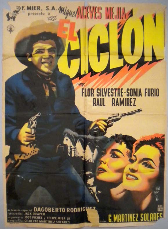 Colorful western film poster features a nice image of a singing cowboy (Miguel Aceves Mejia) holding two six-shooters. The poster has darkened, plus has some fold wear, fold separation, edge wear, and a number of tears -- including some with paper loss. However, it will still display pretty well... The film starred Miguel Aceves Mejia, Flor Silvestre, Sonia Furio, Raul Ramirez and Juan Garcia. $20