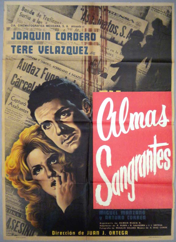 Lurid crime film poster with striking art work. The onesheet sports a great portrait of the two frightened stars -- with aa impressive backdrop of shadowy figures and a blood splattered newspaper. The posters has darkened a bit with age, plus at some point, a paper snipe with a new title was glued over the original titla, but this could probably be removed with steam if so desired. The poster still displays great!... This movie starred Joaquin Cordero, Teresa Velazquez, Miguel Manzano and Dalia Iniguez. $30