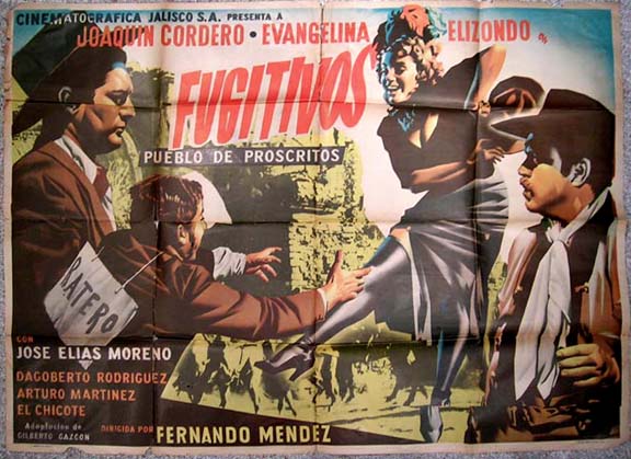 This rare and beautiful poster shows a trio of escaped convicts lusting after a sexy Evangelina Elizondo. Unusual two-sheet poster comes in two separate pieces. It measures approximately 50 inches wide and 37 inches high. There is some fairly heavy wear along the folds, but nothing too terrible. It could be restored, but even as is, it will display pretty well... This movie starred Joaquin Cordero, Evangelina Elizondo, Jose Elias Moreno and Dagoberto Rodriguez. $30