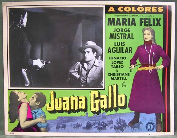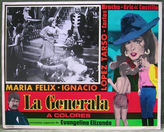 Colorful revolutionary war film lobby card has a nice image of screen icon, Maria Felix in the color art. The nude posterior - which has been crudely censored using magic marker -- may be Ms. Felix, as well! In addition to the marked out buttocks, the card has light wear, but no major flaws... This movie also starred Ignacio Lopez Tarso, Carlos Bracho, Eric del Castillo and Evangelina Elizondo. $10 each