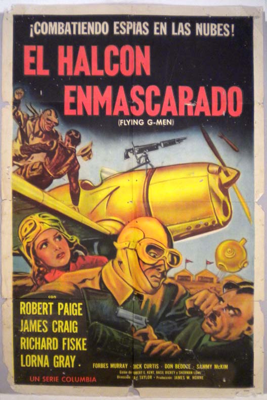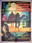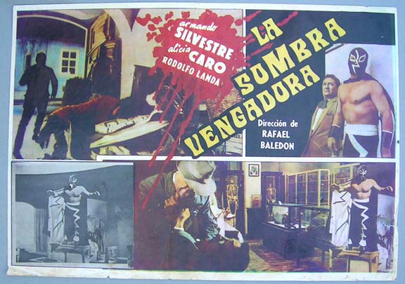 Great masked hero / sci-fi serial poster pictures various scenes from the film, including two showing the masked wrestler, La Sombra. Colorful halfsheet / giant lobby card with some great action images. This is a horizontal format poster that measures approximately 13.5"x 22." The poster has some tears and light wear on the borders and there are two vertical folds at the center, but these flaws are not very distracting. It will display well... This movie starred Armando Silvestre, Alicia Caro, Rodolfo Landa, Lobo Negro and Fernando Oses. $20 Each