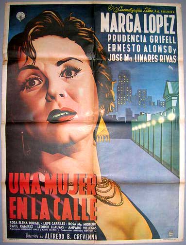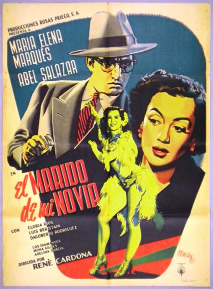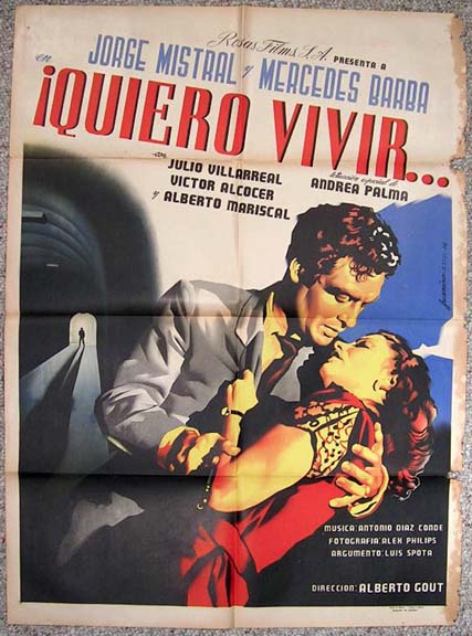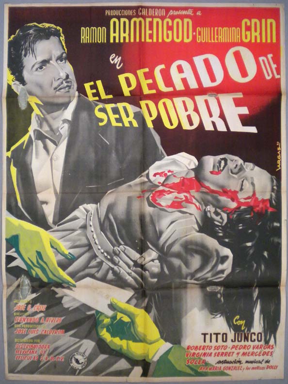Wonderful film-noirish film poster with a striking design ... Armengod holding a dying Grin in his hands. There were several holes in the poster which someone has repaired poorly using masking tape on the back. Still, these flaws are not to distracting, and the poster will display well... This movie starred Ramon Armengod, Guillermina Grin, Tito Junco, Roberto Soto and Pedro Vargas. $40