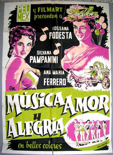 Beautiful Mexican comedy film poster with a striking image of sexy Ms. Pinal, who is being romanced by the three male stars. There is some wear along the two lower horizontal folds, plus some tape on back, but the colors are still bright and it will display well. Appealing onesheet!... This film starred Joaquin Pardave, Silvia Pinal, Fernando Fernandez and Antonio Aguilar. $30