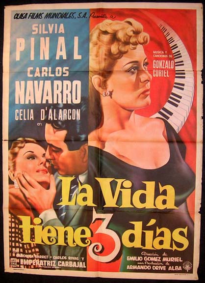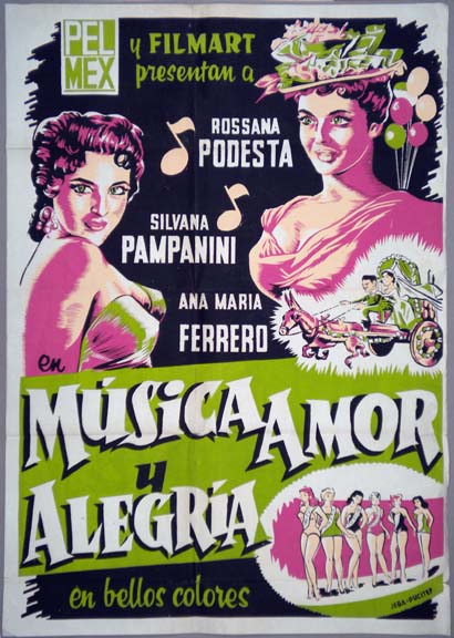 Colorful and stylized romance / musical film poster. The main image shows the lovely Ms. Pinal, with a never-ending piano keyboard circling around her. There is some edge wear plus wear/separation along the folds -- especially the top horizontal fold and a small section of the middle fold. However, these flaws are not too distracting, and the colors are bright... This movie starred Silvia Pinal, Carlos Navarro, Celia D'Alarcon, Carlos Riquelme and Carolina Barret. $20