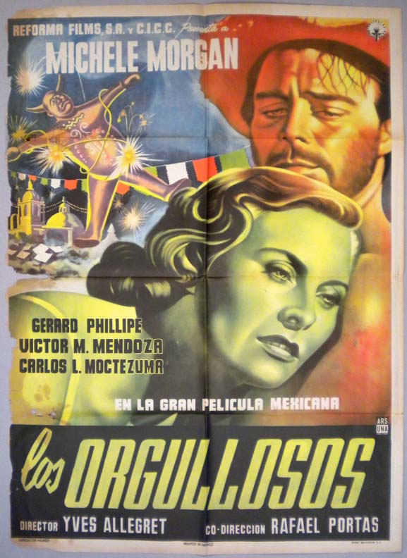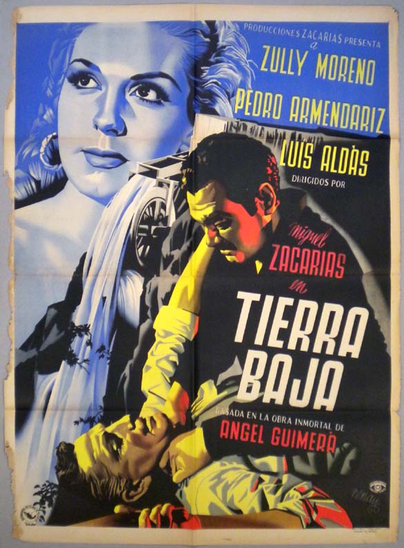 Outstanding noir / crime film poster pictures the sexy Ms. Moreno, who has inspired a death struggle between the two male protagonists, Armendariz and Aldas. Memorable Renau design! There is some water damage / wear / paper loss along the left side border, but this mainly affects only the plain border areas of the poster -- not the printed area -- so it would be easy to restore. Even as is, if matted and framed, the onesheet would display beautifully... This movie starred Pedro Armendariz, Zully Moreno, Luis Aldas and Barbara Gil. $70