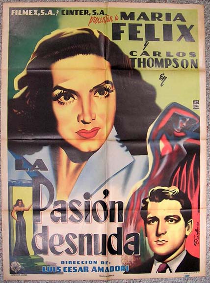 Beautiful Mexican film poster features a classic image of Maria Felix -- perhaps the biggest star in the history of Mexican cinema. The onesheet also pictures a stylized image of a nude woman -- possibly also Ms. Felix. A lovely poster with vibrant coloring. This is a lightly used poster with mild wear and some tape on back reinforcing separation at the center folds, resulting in slight marks of discoloration on the front. Also, someone wrote the film title on the back of the poster, and the lettering has bled through a bit and is now partially visible on the front -- near the word PASION in the title area. However, this flaw is not very distracting, and it could be repaired with minor restoration. Otherwise, the colors are clean and bright and the poster looks great... This movie starred Maria Felix, Carlos Thompson, Eduardo Cuitino and Hector Calcano. $60